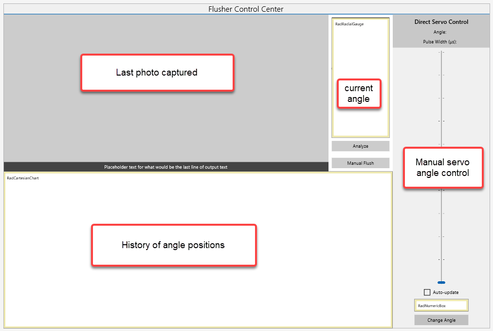 Although the Raspberry Pi isn’t going to be connected to a display in normal use, I did build out a diagnostic dashboard as an admin panel. It uses Telerik UI for UWP charts and gauges to show a history of angle changes and current angle, a slider to manually move the servo to any angle, image to see the last photo taken.