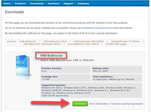 Go to the USB Redirector downloads page, and download “USB Redirector”.