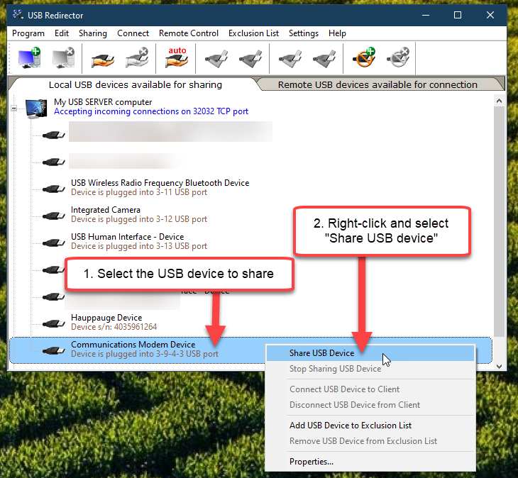 For example, let’s say your PC’s IP address is at 192.168.1.287 and USB Redirector shows it is accepting connections on port 32032, then your side note should look like this 192.168.1.237:32032.