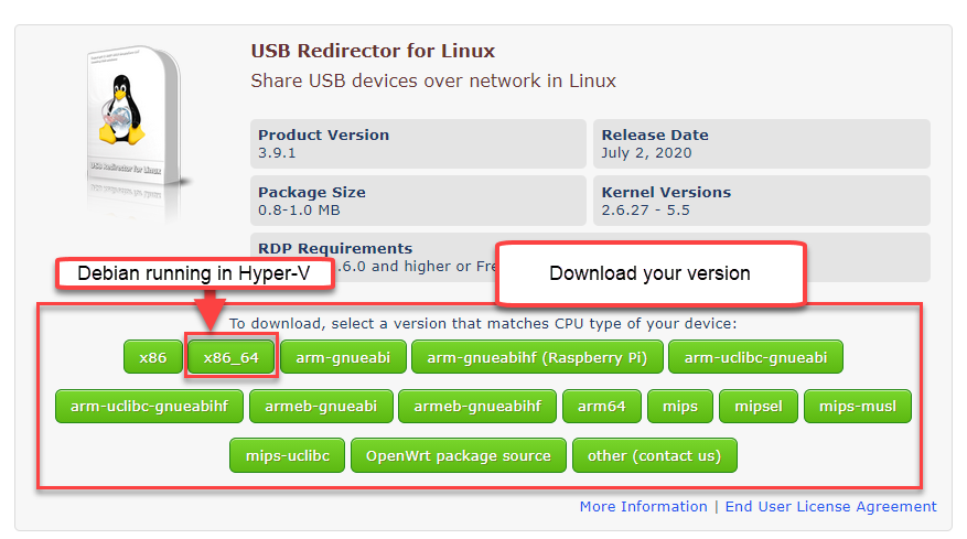 On the Linux machine, go to the USB Redirector downloads page. Scroll down to the <strong>USB Redirector for Linux</strong> section and choose the correct version for your hardware.