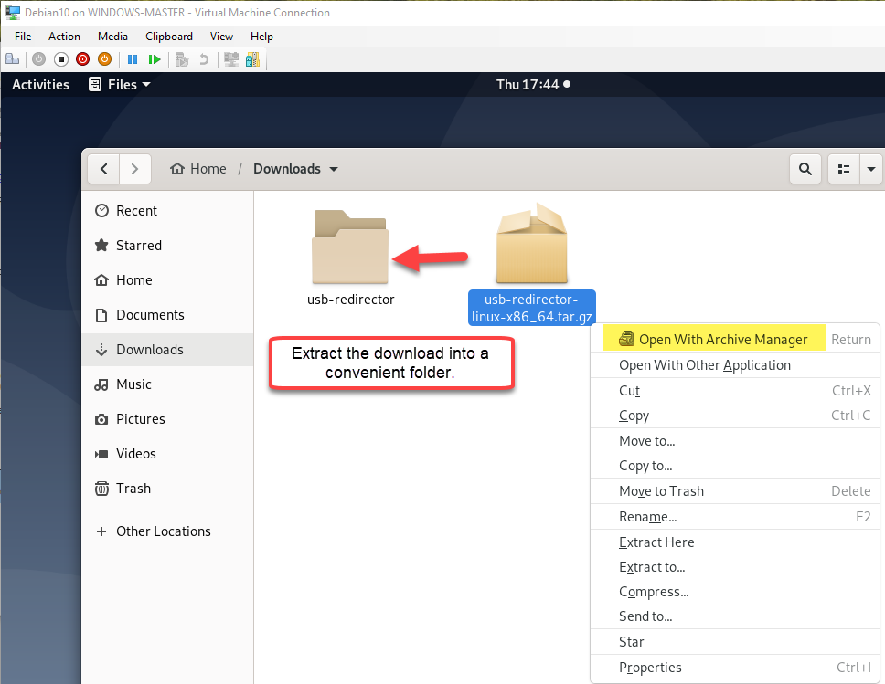 Connect to the Debian VM’s desktop by right-clicking on the VM in Hyper-V and select “Connect”. Once you’re on the desktop, open Firefox and go to the USB NET downloads page