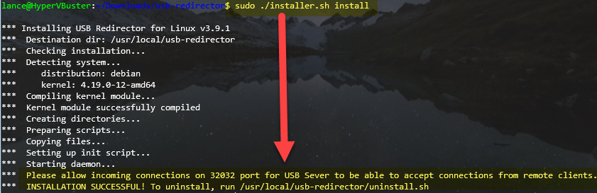 Using the IP address of the Windows PC and the port number (which you should have taken note of on the last step of Windows installation), add the USB Redirector server to the Linux client with the following command