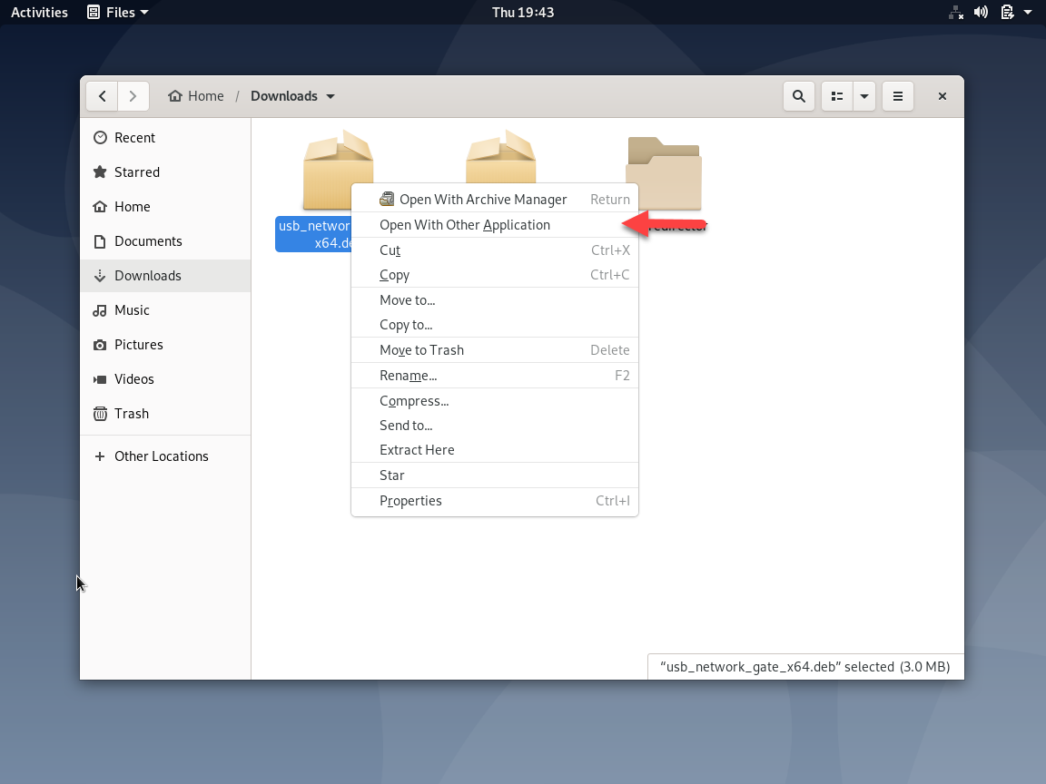 Open Files app and go to your Downloads folder and Right-click on the deb file and select “Open with Other Application”: