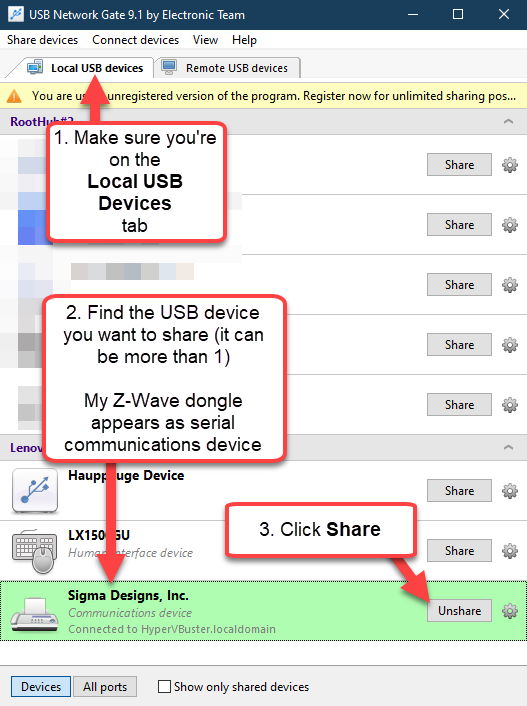 On the Windows 10 you’ll see a list of all the USB devices, click the “share” button next to the Z-Wave dongle device.